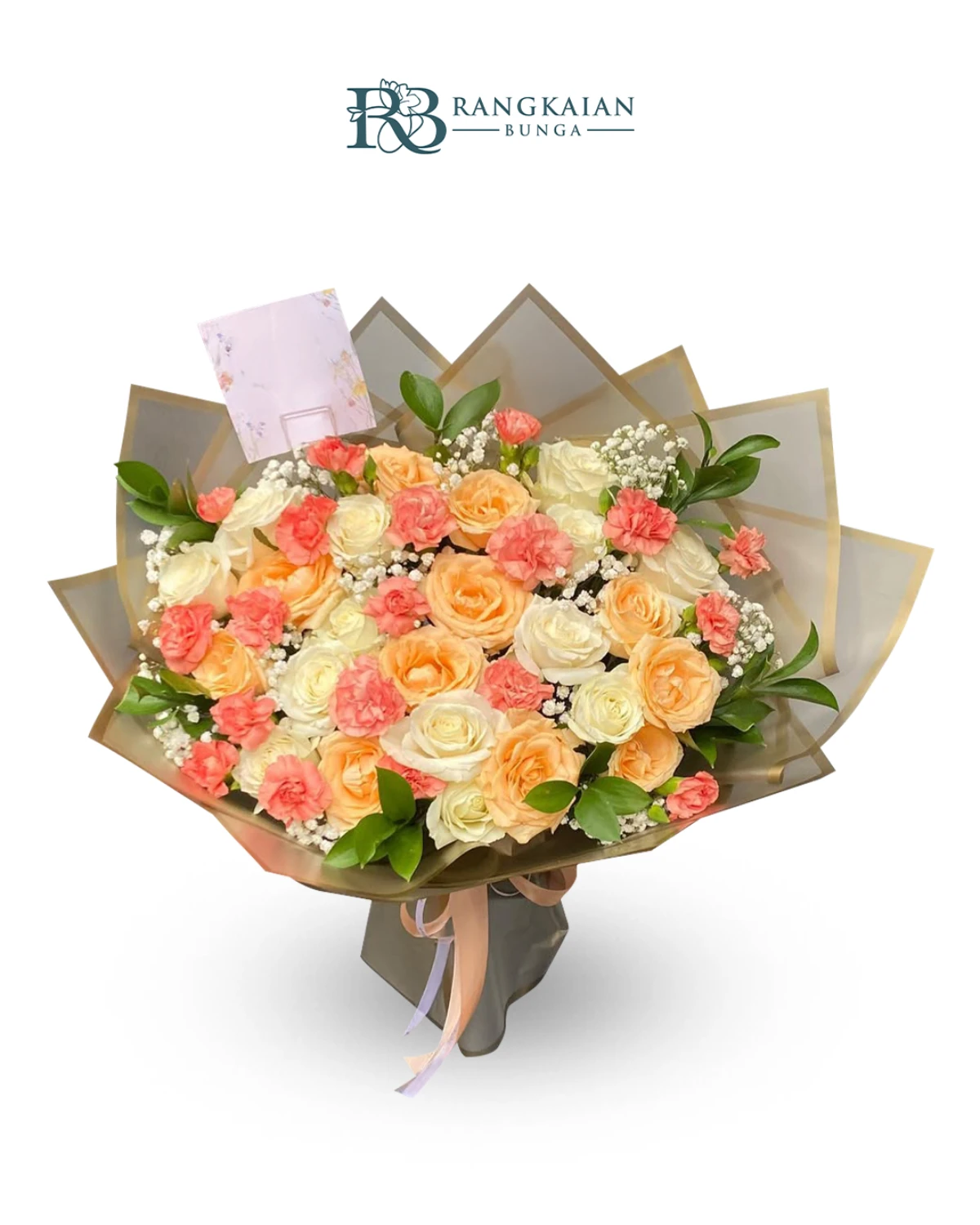 RangkaianBunga Peach & Cream Dream dirangkai estetik dalam wrapping elegan yang cocok untuk momen spesial seperti anniversary, lamaran, ulang tahun, wisuda, hingga hadiah kejutan kasih sayang untuk seorang terkasih. Bouquet ini terdiri dari :